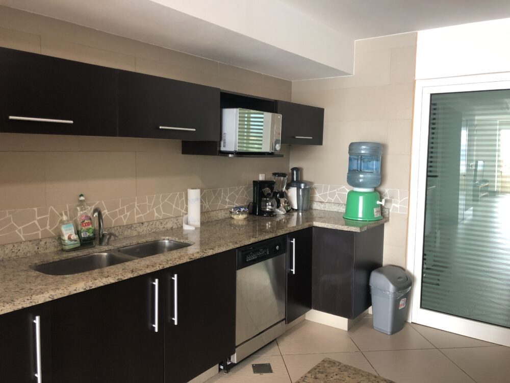 After checking in with Security and the Registration Desk, the entire suite, along with the beaches right out front, the common areas 2 pools, hot tub, kids playroom, tennis court and massage facilities are all there for you to enjoy. A gym is also available, free for 15+ night guests and $150 pesos per day per person for guests staying less than 15 nights. There is also an administrative desk and business centre. The grounds provide wonderful green lawns, two pools for adults and children, and is located right near the beach. A small snack bar, which offers drinks, appetizers and lunches, is located by the pools.