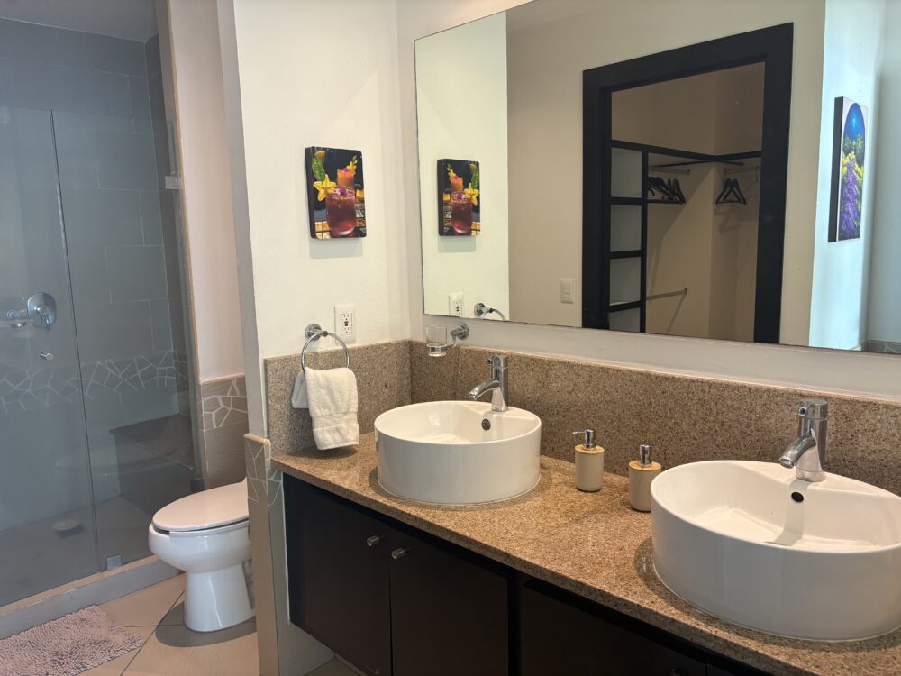 The Master Bedroom has a King sized bed, with its own ensuite with double sinks, large shower and sliding doors that open onto the patio. It offers breathtaking views of the Pacific Ocean, the Bay and the mountains, allowing you to enjoy incredible sunrises and sunsets.